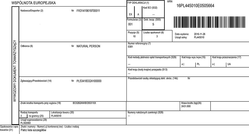 Цей документ може оформлятися або самим відправником, або компанією-перевізником на підставі документів на вантаж (інвойс, packing list) в одному з численних митних агентств на шляху перевезення товару. Експортну декларацію необхідно спочатку “відкрити”, тобто оформити її в електронній митній системі ЄС, а потім “закрити” в момент, коли вантаж залишає територію Європейського Союзу, що також відбувається в електронній системі.