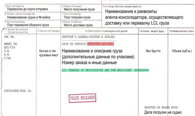 - У документах може бути примітка, що «LCL Charges at destination are for receivers' account» — тобто витрати на послуги CFS у порту призначення сплачує отримувач.